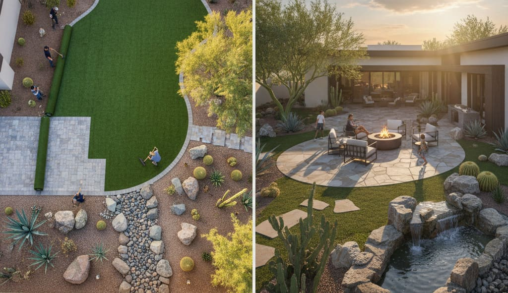 Solution: We started with professional demolition of the old concrete slab. We then installed a covered patio area with modern, large-format pavers near me for low upkeep. The remaining grass area was replaced with premium artificial turf for yard use, dramatically cutting their water bills and freeing up their weekends from yard work. The result is a year-round, beautiful space that requires minimal effort—a perfect example of adapting to WFH and retirement lifestyles.